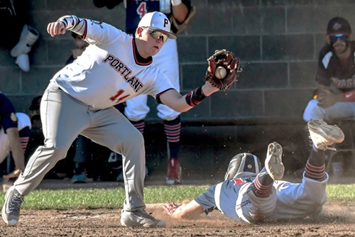 Photo by JOEL TAKARSH/for The Daily Courier PIC #0168 (1st inning) Nuggets #12 squeaks out a triple as he slides into third just ahead of the tag.