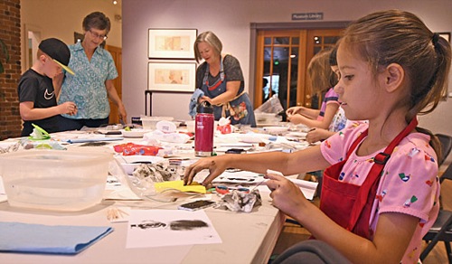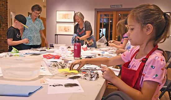 Victoria Javoric, 8, (right) works on a project during a printmaking workshop for kids at the Grants Pass Museum of Art on Tuesday, July 25, 2017. (Scott Stoddard / Daily Courier)