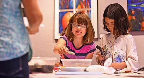 Eirin O'Neill, 8, (left) and Lyzeah Marroquin, 9, work on projects during a printmaking workshop for kids at the Grants Pass Museum of Art on Tuesday, July 25, 2017. (Scott Stoddard / Daily Courier)