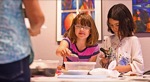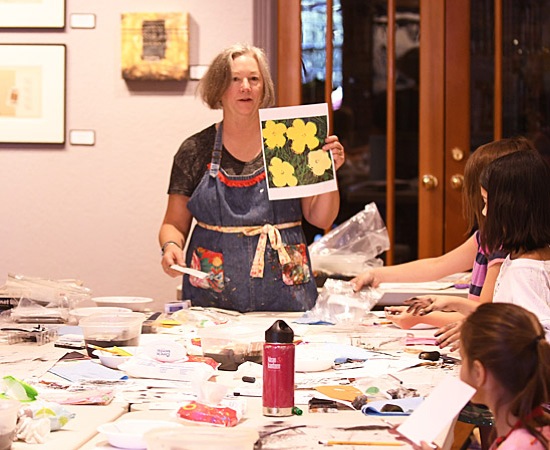 Artist Karen O'Brien displays an example of Andy Warhol's work to students during a printmaking workshop for kids at the Grants Pass Museum of Art on Tuesday, July 25, 2017. (Scott Stoddard / Daily Courier)
