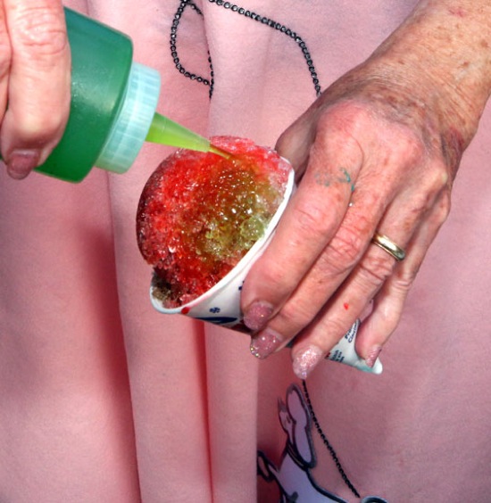 Patti Reedy squirts plenty of flavor and color onto a snow cone at the Back to the Fifties concert at Riverside Park Tuesday. "We've already made about 350 so far and it's not even intermission yet," she said. Reedy, a member of the Soroptimist International River Valley colored most of those. "They all want the rainbow," she said.