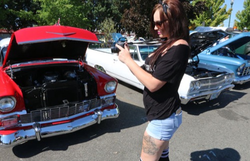 Christina Kelley stops to photograph some of the autos at the Classic Car Pre-show Friday held at the Growers' Market lot. She and her grandmother, Marilyn Loomis, are visiting form Canyonville. "I owned a '56 Chevy," Loomis said. "But I was 18."