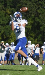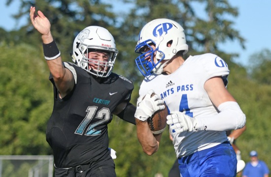 Grants Pass defensive back Zack Williams tries to elude Century quarterback Jack Wilson after Williams picked off a Wilson pass, setting up a Caveman touchdown.