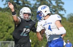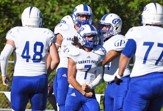 Grants Pass quarterback Blain Hobbs celebrates his long touchdown pass to Tayler Phillips in the first half of the Cavemen's victory over Century on Friday afternoon in Hillsboro.