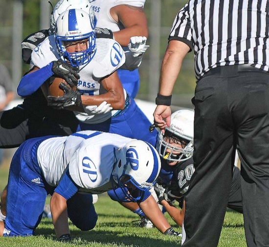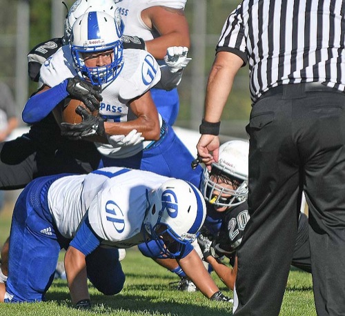 SCOTT STODDARD/Daily Courier Grants Pass running back Vincent Washington peers down the goal line as he goes into the end zone for a touchdown.