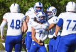 Grants Pass defensive lineman Corbin Anderson (56) celebrates with teammate Austin Byrd after Anderson's sack of Century quarterback Jack Wilson (12) late in the fourth quarter.