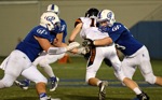 In the final seconds of the first half, Grants Pass quarterback Blain Hobbs (7) looks for a receiver as he is pursued by Roseburg's Brandon Jeffers (42) and Hunter Blix.