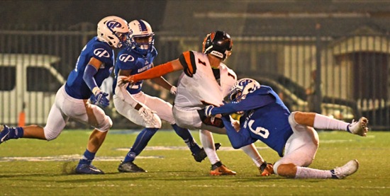 Tayler Phillips (6) of Grants Pass hauls down Garrett Russell (1) of Roseburg in the fourth quarter.