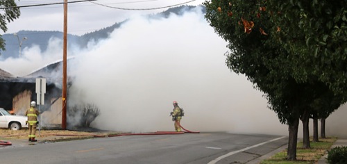 Smoke billows out of a house and completely obscures Ninth Street as firefighters work to contain a structure fire at the intersection of Ninth Street and G Street on Monday.