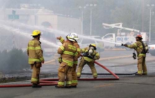 Firefighters set up multiple water lines to combat flames shooting through the front entrance of 323 SE G St. on Monday afternoon. The incident snarled traffic in the area and gutted the residence.