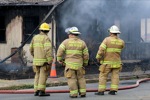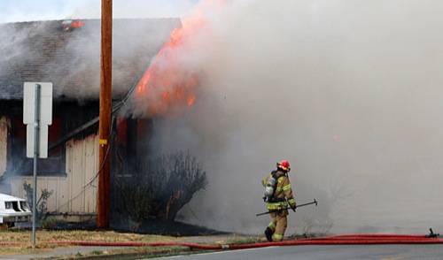 WILL RUBIN/Daily Courier A Grants Pass firefighter hoists his oxygen tank and wields a pickaxe as he prepares to combat a structure fire at 323 SE G St. up close Monday afternoon.
