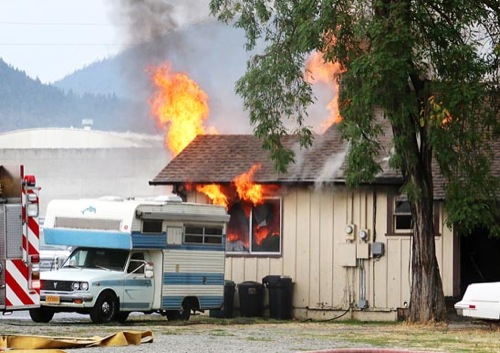 Flames shoot out of a residence at 323 SE G St. on Monday afternoon. Fire crews managed to contain the fire to the structure, but the incident shut down portions of Ninth Street and G Street for hours.