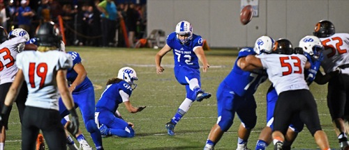 SCOTT STODDARD/Daily Courier Grants Pass kicker Daniel Cronin (72) hits the first of his two field goals on the evening for the Cavemen.