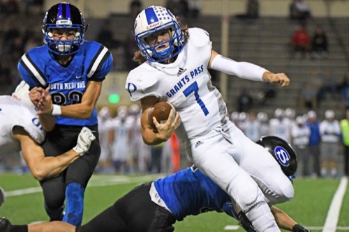 Grants Pass quarterback Blain Hobbs scrambles for yardage in the first half of the Cavemen's game against South Medford. The Panthers prevailed over the Cavemen 40-21 at Spiegelberg Stadium.