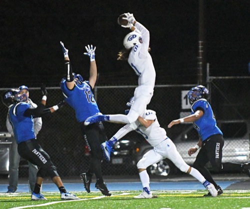 Grants Pass wide receiver Korbin Lopez outleaps a trio of South Medford defenders to grab a pass from Blain Hobbs.
