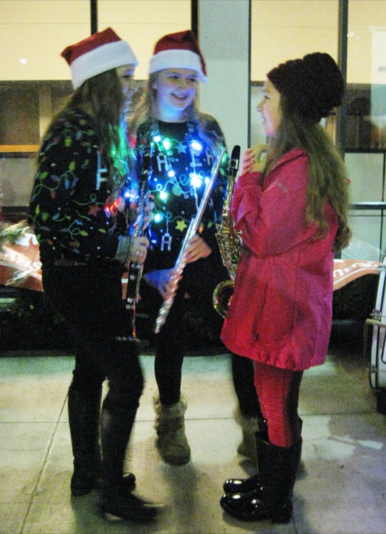 EDITH DECKER/Daily Courier Fleming Middle School band members take cover under a building cover from a light rain before the parade Saturday.
