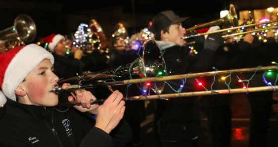 TIMOTHY BULLARD/Daily Courier The Grants Pass High School Marching Band trombone section decorated their horns with mini-lights.