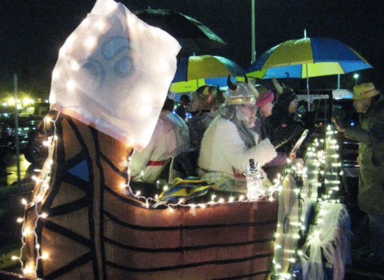 EDITH DECKER/Daily Courier The Scandinavian Heritage Club members protect their dragon head on their Viking ship float before the parade began Saturday.