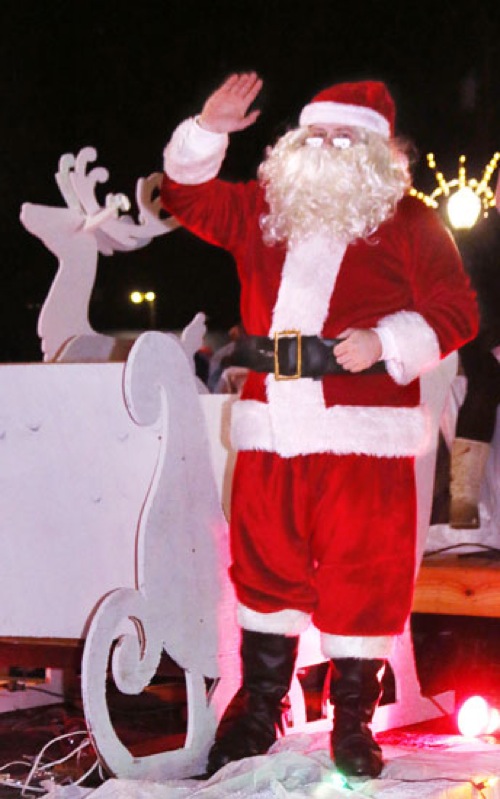 TIMOTHY BULLARD/Daily Courier The guest of honor rode in on the last float of the Grants Pass Christmas Parade up Sixth Street Saturday night.