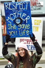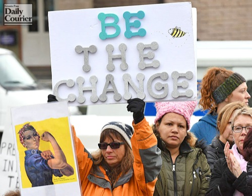 SCOTT STODDARD/Daily Courier Noel Hastings of Grants Pass holds her sign aloft during the Grants Pass Women's March on Jan. 20, 2018.