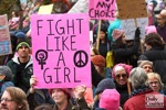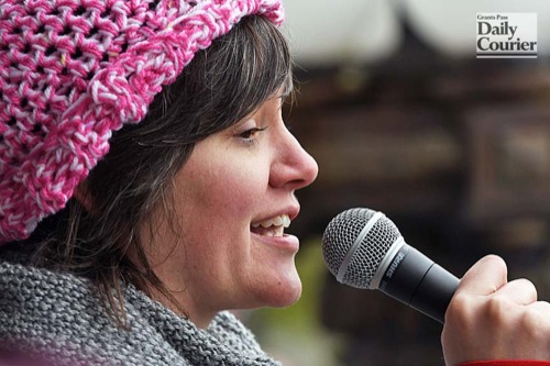 Madeline DeCourcey addresses the Grants Pass Women's March crowd from the steps of the Josephine County Courthouse on Jan. 20, 2018.