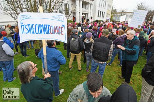 Susan Thornburg's sign at the Grants Pass Women's March has a local flavor as she participates in a post-march rally at the Josephine County Courthouse on Jan. 20, 2018.