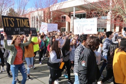 About 300 Grants Pass High School students circled the campus for 17 minutes, chanting “Enough is enough,” “Books not Guns” and other messages protesting gun violence. A dozen police attended the event, which modeled others around the country at 10 a.m. The 17 minutes represented all the victims at the Parkland, Florida, high school mass shooting one month ago.