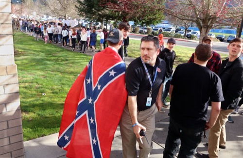 Grants Pass High School Principal Ryan Thompson (center) quickly moved in to reduce tensions between two students when one of them showed up to the walkout wearing a Confederate battle flag in a counter protest.