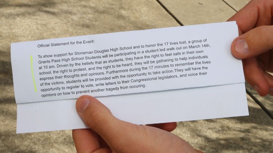 TIMOTHY BULLARD/Daily Courier A student goes over a statement scheduled to be read near the end of the walkout.