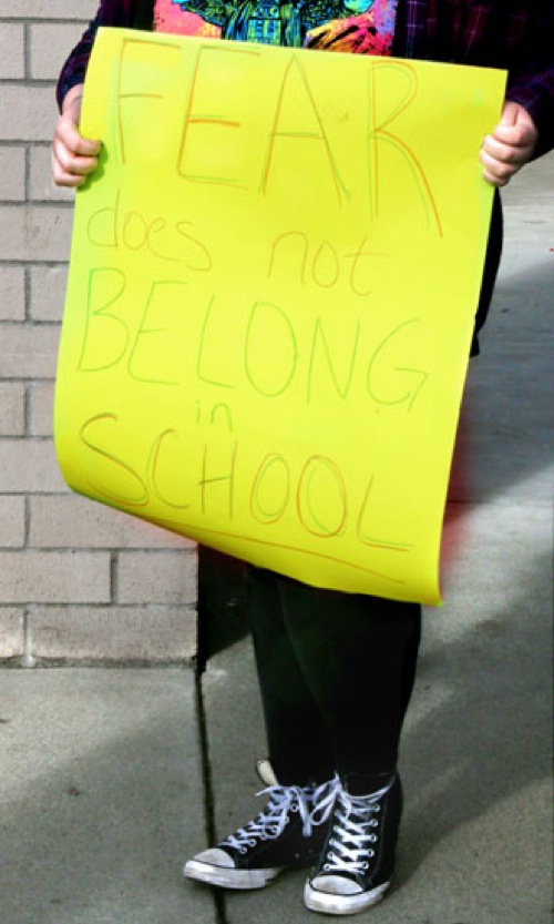 TIMOTHY BULLARD/Daily Courier Grants Pass High School student Jane Marsh holds a "Fear does not belong in School" sign at the beginning of the walkout.