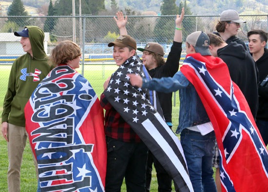 TIMOTHY BULLARD/Daily Courier A small group of counter demonstrators, one wrapped in a Confederate battle flag, were kept apart from the rally.