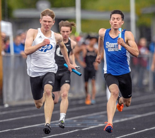 Photo by JOEL TAKARSH/for The Daily Courier, PIC #0016 South Medford edges out Grants Pass in the boys 400 meter relay