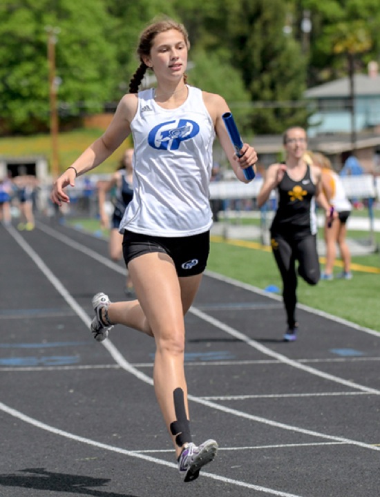 Photo by JOEL TAKARSH/for The Daily Courier, PIC #0375 GP's Brook Johnson finishes first in the girls 400 meter relay