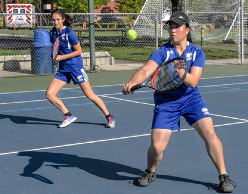 Photo by JOEL TAKARSH/for The Daily Courier, PIC #0295 (Left to Right) Calista Van Delden and An Mei Goei playing doubles