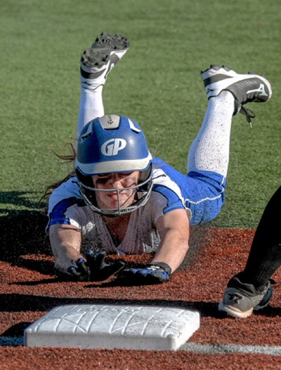 Photo by JOEL TAKARSH/for The Daily Courier, PIC #1250 GP #3 slides head first into third base just ahead of the tag.