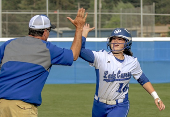 Photo by JOEL TAKARSH/for The Daily Courier, PIC #2804 GP #16 is 'Hi-Fived' by her coach as she rounds 3rd base after her homerun in the 6th inning.