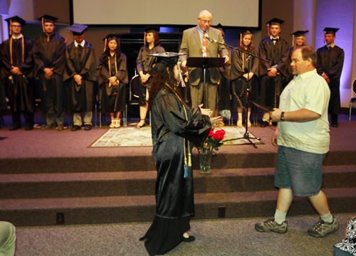 TIMOTHY BULLARD/Daily Courier A parent moves to give his daughter her diploma during the New Hope Christian School graduation at the River Valley Downtown Church Saturday.