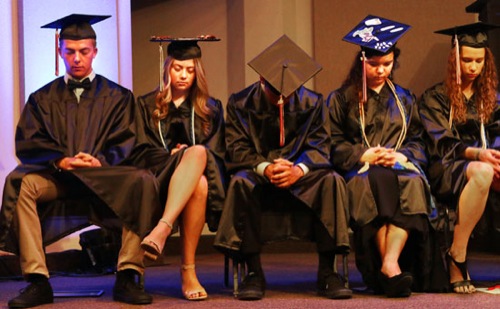 New Hope Christian School graduates close their eyes and participate in prayer before the ceremony begins at the River Valley Downtown Church Saturday.
