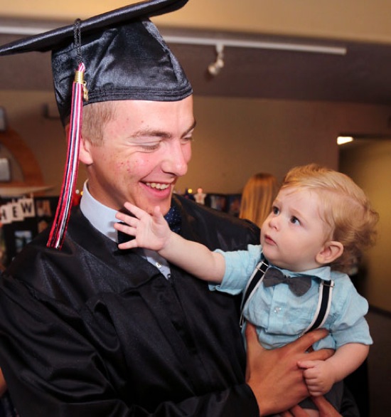 New Hope Christian School graduate Matthew Aslakson's mortarboard tassel gets some attention from nephew Vincent Simmons, 7 months, at River Valley Downtown Church Saturday.