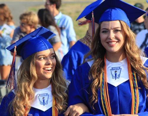 Tylor Logue (left) and Melanie Buchanan enter Mustang Stadium at the beginning of the Hidden Valley High School graduation ceremony on Wednesday in Murphy.