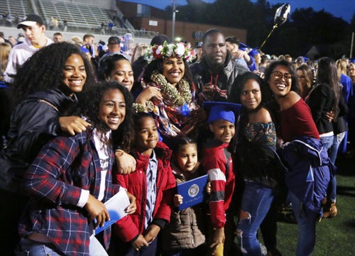 Keziah Manna Baasha (with flowers and Polynesian leis) was joined by family and friends for photographs after the Grants Pass High School graduation Friday night.