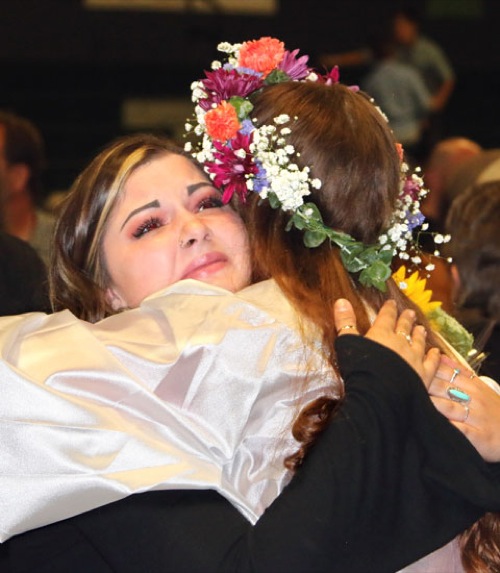 TIMOTHY BULLARD/Daily Courier Rogue River High School graduate Willow Ryon (right) gets an enduring hug from good friend Amarih Ritchie Saturday just after the ceremony.