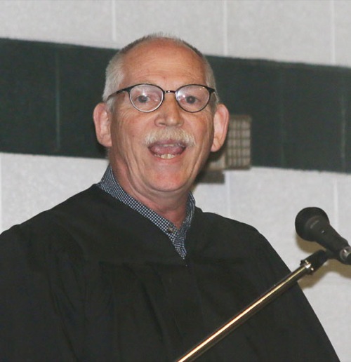 TIMOTHY BULLARD/Daily Courier Phil Stobbe, seventh and eighth grade Language Arts instructor, gave an inspirational message at the Rogue River High School graduation.