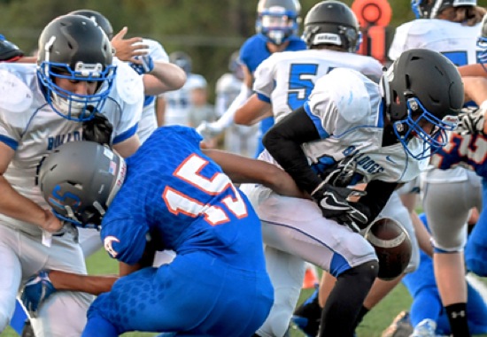 Photo by JOEL TAKARSH/for The Daily Courier, PIC #0174 HV #15 uses his right arm to dislodge the ball from SUTH #10 for a fumble recovered by HV