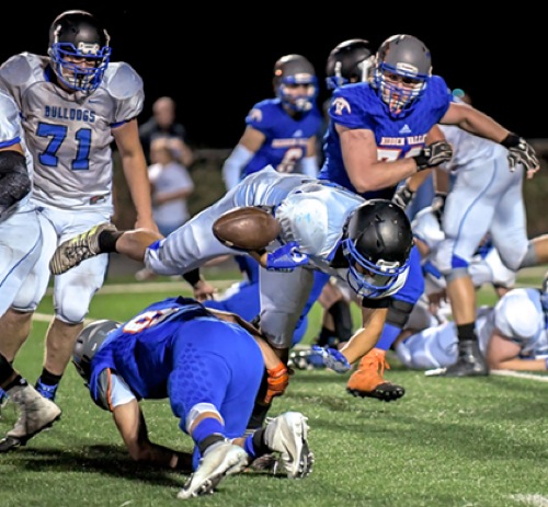 Photo by JOEL TAKARSH/for The Daily Courier, PIC #1065 HV #9's hit on SUTH #22 causes a fumble recovered by HV