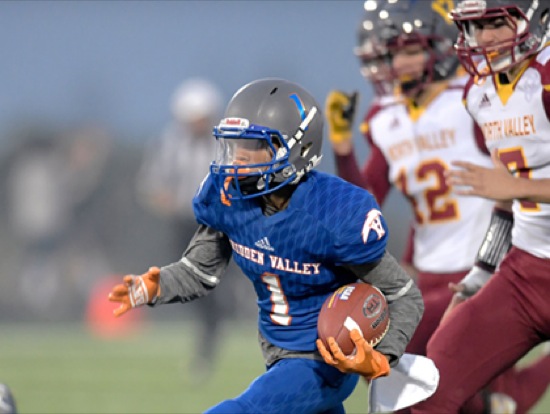 Photo by JOEL TAKARSH/for The Daily Courier, PIC #0006 HV # 1 takes opening game kickoff for a TD NV #12 and NV #7 can't catch him