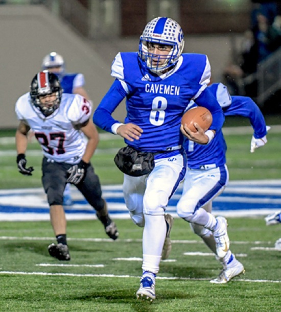Photo by JOEL TAKARSH/for The Daily Courier,GP PIC #0777 GP Quarterback #8 on a keeper for a big gain
