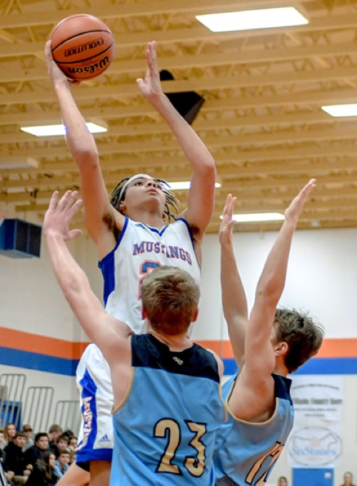 Photo by JOEL TAKARSH/for The Daily Courier, PIC #0780 (L to R) HV #21, MC #23, MC #12 Mustangs lose it 66-79.