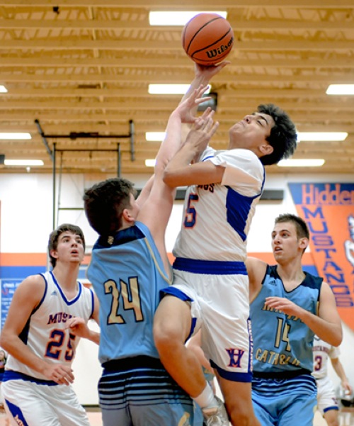 Photo by JOEL TAKARSH/for The Daily Courier, PIC #0858 (L to R) HV #25, MC #24, HV #5, MC #14 Mustangs lose it 66-79.