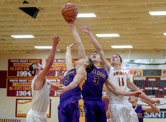 Photo by JOEL TAKARSH/for The Daily Courier, PIC #0234 (L to R) NV #33, BAK #5, BAK #3, NV #11 Knights lose it 56-43.